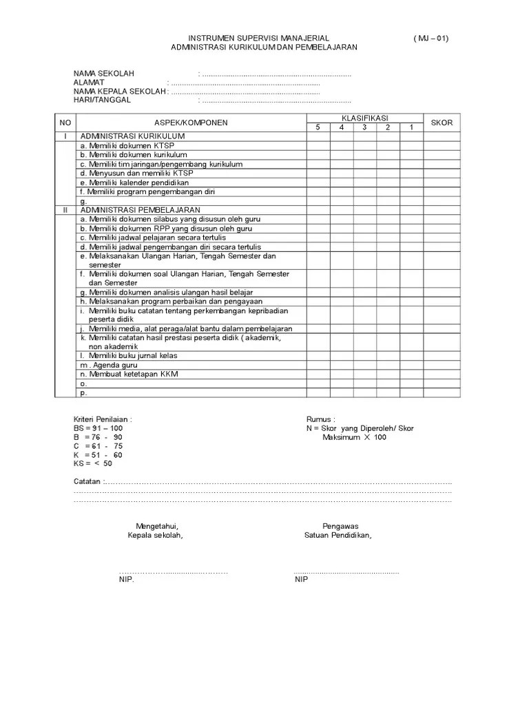 Permendikbud tersebut menjelaskan bahwa tugas kepala sekolah adalah manajerial, supervisi guru dan tenaga kepedidikan dan kewirausahaan. Lembar supervisi administrasi guru sekolah.tahun pelajaran. Dari hasil wawancara, observasi, pengumpulan data dokumen dapat disimpulkan bahwa kegiatan supervisi harus memerlukan instrumen supervisi yang lengkap. Penilaian yang dilakukan oleh kepala sekolah. Supervisor datang ke kelas untuk mengobservasi guru mengajar,.